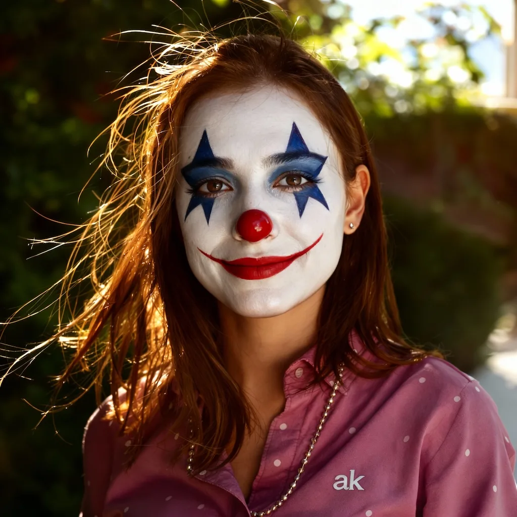 Transform your photos with realistic horror clown face paint featuring cobalt-blue star designs, glossy red nose, and eerie smile using Nano Banana Pro - perfect for Halloween and creative portraits
